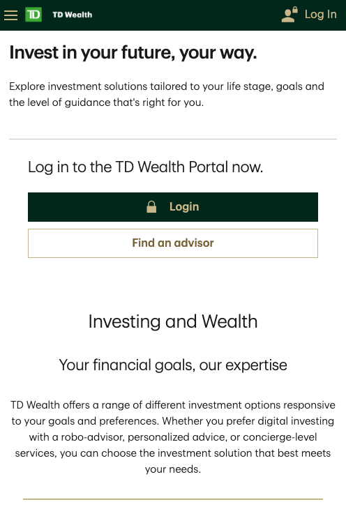 *I can’t show the true TD Wealth Portal here, because it’s proprietary and login-protected. I designed the first mobile screen above for this portfolio, and the other screens are from the public site TD.com.