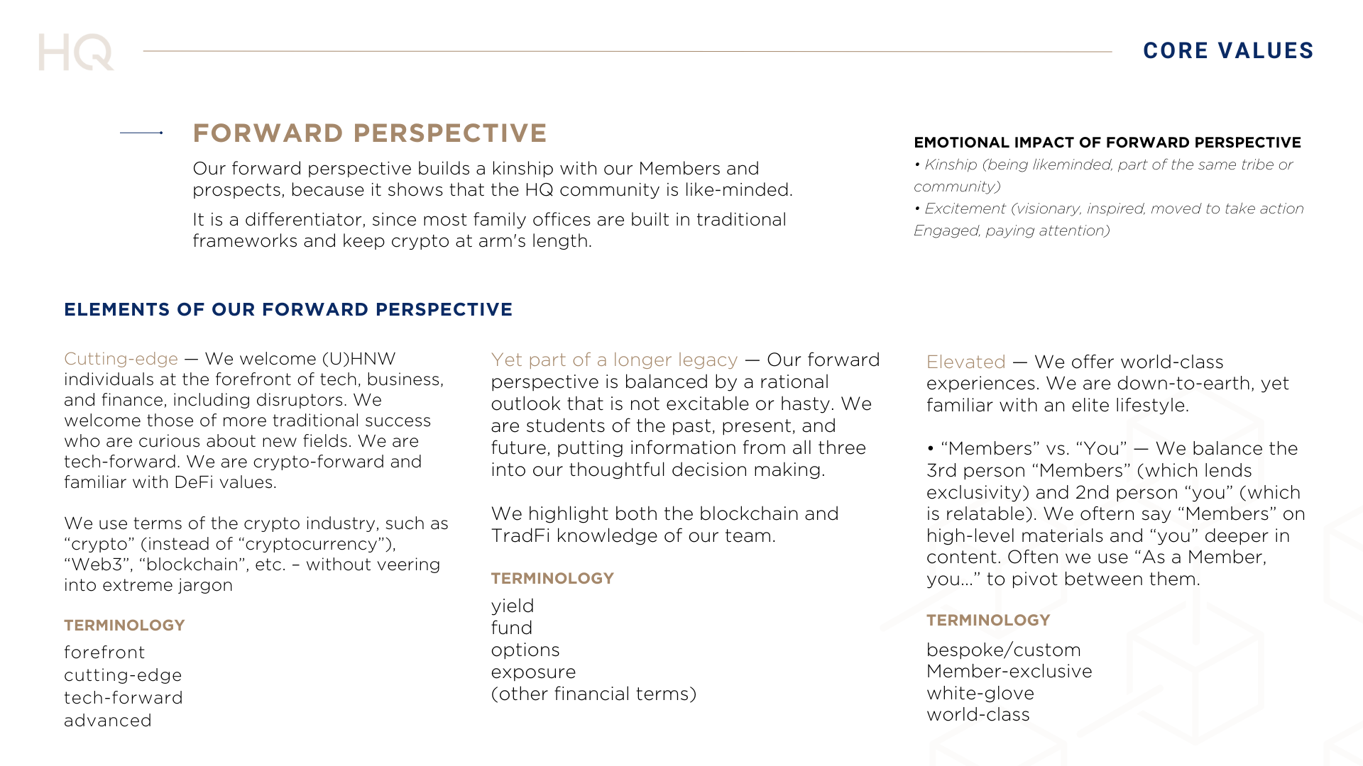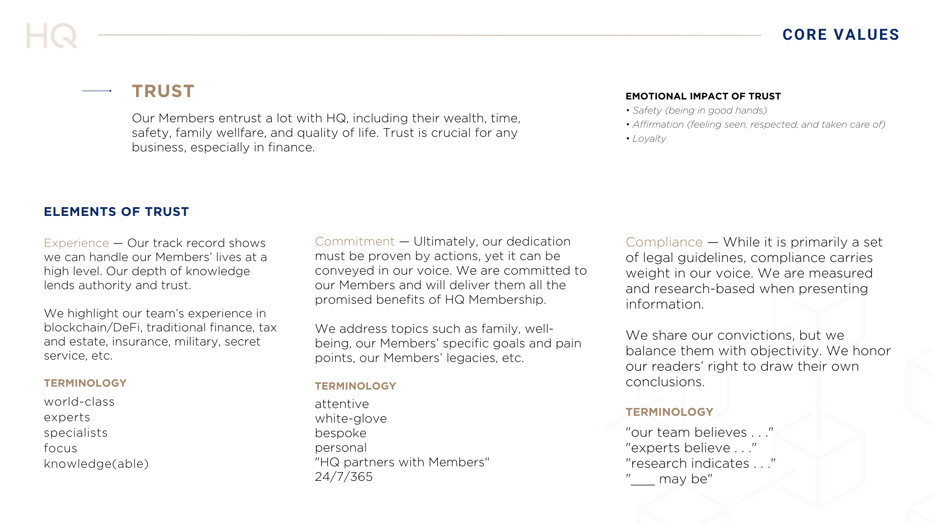 The brand voice became fundamental to HQ's brand and communications, including an app, a newsletter, a sales brochure, white papers, and a public site — each rich with expert knowledge in wealth, blockchain, cybersecurity, risk, compliance, tax & estate, and other topics.